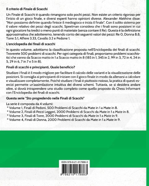 In questo volume, adottiamo la classificazione proposta nell'Enciclopedia dei finali di scacchi. Quest'ultima è uno studio "esaustivo" dei finali di scacchi pubblicato dall'Chess Informant, l'editore dell'Enciclopedia delle aperture di scacchi. Tutte le categorie sono coperte: * Almeno 1 Pedone/Re isolato, * 2 Pedoni uniti/2 Pedoni, * 2 Pedoni/2 Pedoni, * 3 Pedoni/3 Pedoni, * 4 Pedoni/4 Pedoni, * 5 Pedoni/5 Pedoni, * 6 Pedoni/6 Pedoni, * 7 Pedoni/7 Pedoni, * 8 Pedoni/8 Pedoni, * 2 Pedoni/1 Pedone, * 3 Pedoni/2 Pedoni, * 4 Pedoni/3 Pedoni, * 5 Pedoni/4 Pedoni, * 6 Pedoni/5 Pedoni, * 7 Pedoni/6 Pedoni, * 8 Pedoni/7 Pedoni, * Altre Finali di Pedoni. In questo volume troverete 766 problemi di scacchi. Il titolo annuncia 500 problemi di scacchi. Quindi, ce ne sono 266 in più. Ebbene, molte situazioni sono simili. Abbiamo scelto di includerle piuttosto che limitare il numero a 500, poiché la ripetizione favorisce l'assimilazione. Per ogni categoria di finali, proponiamo problemi scacchistici che vanno da Scacco matto in 1 a 8 (185 in 1, 345 in 2, 99 in 3, 72 in 4, 24 in 5, 29 in 6, 7 in 7 e 5 in 8). Infine, è un libro di grande formato per una maggiore comodità e leggibilità. Questa serie "Sto progredendo nelle Finali di Scacchi" è composta da 4 volumi: * Vol. 1, Finali di Pedoni, 500 Problemi di Scacchi da Mate in 1 a 8. * Vol. 2, Finali di Pezzi Leggeri, 2000 Problemi di Scacchi da Mate in 1 a 8. * Vol. 3, Finali di Torre, 2000 Problemi di Scacchi da Mate in 1 a 9. * Vol. 4, Finali di Donna, 2000 Problemi di Scacchi da Mate in 1 a 9. Finali di scacchi e principianti, Quale beneficio? Studiare i finali è il modo migliore per facilitare il calcolo delle varianti e la visualizzazione delle posizioni. Si consiglia ai principianti di iniziare con il gioco finale in modo da allenarsi a calcolare e visualizzare completamente. Poiché studiare i finali è piuttosto noioso, la pratica di questi esercizi permette un'assimilazione intuitiva dei diversi schemi.
