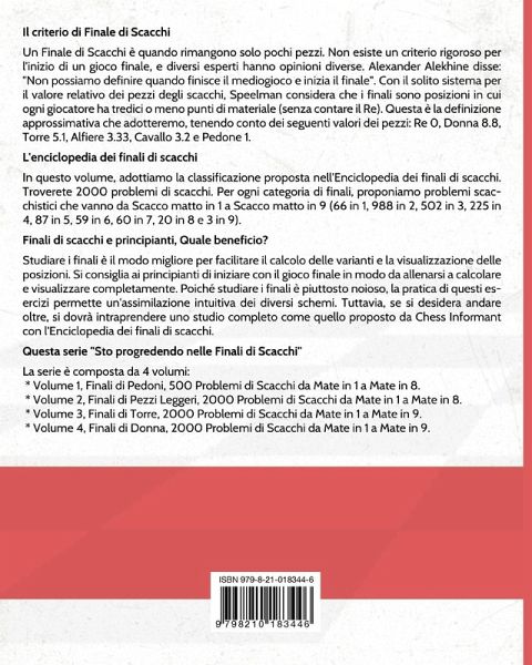 In questo volume, adottiamo la classificazione proposta nell'Enciclopedia dei finali di scacchi. Quest'ultima è uno studio "esaustivo" dei finali di scacchi pubblicato dall'Chess Informant, l'editore dell'Enciclopedia delle aperture di scacchi. Tutte le categorie sono coperte: * Torre / Re isolato, * Torre / Pedoni, * Torre / Cavallo, * Torre / Alfiere, * Torre sola / Torre sola, * Torre e 1 Pedone / Torre sola, * Torre e Pedoni / Torre sola, * Torre e 2 Pedoni / Torre e 1 Pedone, * Torre e Pedoni / Torre e Pedoni con un numero disuguale di Pedoni, * Torre e Pedoni / Torre e Pedoni con un numero uguale di Pedoni, * Torre / 2 Pezzi Leggeri, * Torre / 3 Pezzi Leggeri, * Torre e 1 Pezzo Leggero / Pedoni, * Torre e 1 Pezzo Leggero / 1 Pezzo Leggero, * Torre e 1 Pezzo Leggero / Torre, * Altre Finali di Torre. In questo volume troverete 2000 problemi di scacchi. Per ogni categoria di finali, proponiamo problemi scacchistici che vanno da Scacco matto in 1 a Scacco matto in 9 (66 in 1, 988 in 2, 502 in 3, 225 in 4, 87 in 5, 59 in 6, 60 in 7, 20 in 8 e 3 in 9). Infine, è un libro di grande formato per una maggiore comodità e leggibilità. Questa serie "Sto progredendo nelle Finali di Scacchi" è composta da 4 volumi: * Vol. 1, Finali di Pedoni, 500 Problemi di Scacchi da Mate in 1 a 8. * Vol. 2, Finali di Pezzi Leggeri, 2000 Problemi di Scacchi da Mate in 1 a 8. * Vol. 3, Finali di Torre, 2000 Problemi di Scacchi da Mate in 1 a 9. * Vol. 4, Finali di Donna, 2000 Problemi di Scacchi da Mate in 1 a 9. Finali di scacchi e principianti, Quale beneficio? Studiare i finali è il modo migliore per facilitare il calcolo delle varianti e la visualizzazione delle posizioni. Si consiglia ai principianti di iniziare con il gioco finale in modo da allenarsi a calcolare e visualizzare completamente. Poiché studiare i finali è piuttosto noioso, la pratica di questi esercizi permette un'assimilazione intuitiva dei diversi schemi.