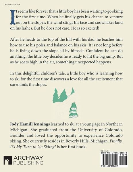 It seems like forever that a little boy has been waiting to go skiing for the first time. When he finally gets his chance to venture out on the slopes, the wind stings his face and snowflakes land on his lashes. But he does not care. He is so excited! After he heads to the top of the hill with his dad, he teaches him how to use his poles and balance on his skis. It is not long before he is flying down the slope all by himself. Confident he can do anything, the little boy decides he is ready to hit the big jump. But as he soars high in the air, something unexpected happens. In this delightful childrens tale, a little boy who is learning how to ski for the first time discovers a love for all the excitement that surrounds the slopes.