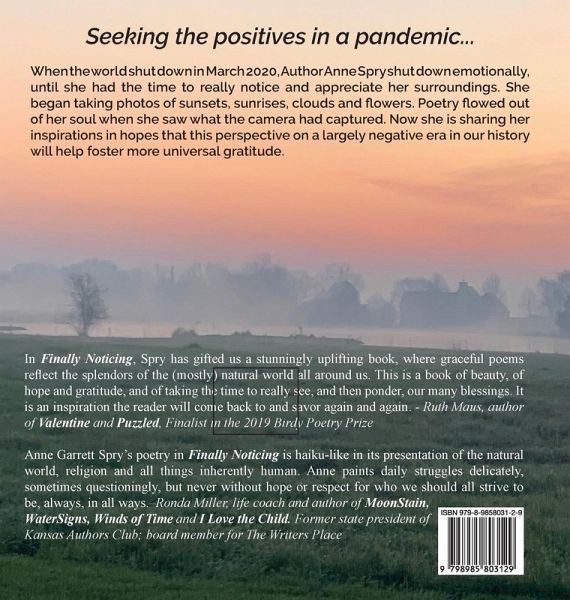 Seeking the positives in a pandemic... When the world shut down in March 2020, Author Anne Spry shut down emotionally...until she had the time to really notice and appreciate her surroundings. She began taking photos of sunsets, sunrises, clouds, and flowers. Poetry flowed out of her soul when she saw what the camera had captured. The result was a new gratefulness for the many blessings she suddenly found. Despite the new isolation brought by the pandemic, despite no longer being able to hug her grandchildren and read them a book, she was not alone. She had writing, photography, friends she could call, and Facebook friends who were all hungry to connect on an even deeper level than before the pandemic. Like everyone else, she scrambled to learn new technologies that would keep her connected virtually. Additionally, and even more importantly, she learned how to be truly still, long enough to notice the world of nature and the beauty all around her. Now she is sharing her inspirations in hopes that this perspective on a largely negative era in our history will result in more universal gratitude and hope.
