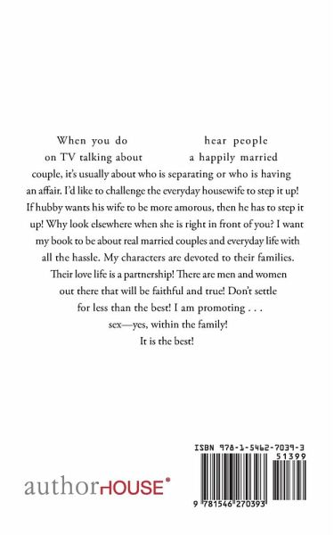 When you do hear people on TV talking about a happily married couple, it's usually about who is separating or who is having an affair. I'd like to challenge the everyday housewife to step it up! If hubby wants his wife to be more amorous, then he has to step it up! Why look elsewhere when she is right in front of you? I want my book to be about real married couples and everyday life with all the hassle. My characters are devoted to their families. Their love life is a partnership! There are men and women out there that will be faithful and true! Don't settle for less than the best! I am promoting . . . sex-yes, within the family! It is the best!