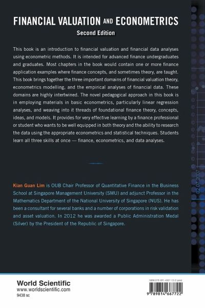 This book is an introduction to financial valuation and financial data analyses using econometric methods. It is intended for advanced finance undergraduates and graduates. Most chapters in the book would contain one or more finance application examples where finance concepts, and sometimes theory, are taught. This book is a modest attempt to bring together several important domains in financial valuation theory, in econometrics modelling, and in the empirical analyses of financial data. These domains are highly intertwined and should be properly understood in order to correctly and effectively harness the power of data and statistical or econometrics methods for investment and financial decision-making. The contribution in this book, and at the same time, its novelty, is in employing materials in basic econometrics, particularly linear regression analyses, and weaving into it threads of foundational finance theory, concepts, ideas, and models. It provides a clear pedagogical approach to allow very effective learning by a finance student who wants to be well equipped in both theory and ability to research the data. This is a handy book for finance professionals doing research to easily access the key techniques in data analyses using regression methods. Students learn all 3 skills at once — finance, econometrics, and data analyses. It provides for very solid and useful learning for advanced undergraduate and graduate students who wish to work in financial analyses, risk analyses, and financial research areas.