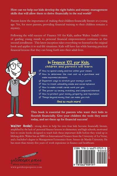 How can we help our kids develop the right habits and money management skills that will allow them to thrive financially in the real world? Parents know the importance of making their children financially literate at a young age. Yet, for most parents, providing financial training to their children remains a mystery. Following the wild success of Finance 101 for Kids, author Walter Andal's vision of guiding young minds to personal financial empowerment continues in this second installment. This latest inception takes everything we learned in the original book and applies it to real-life situations. Kids will have fun while learning practical financial lessons that they can bring forth into their adult lives. In Finance 102 for Kids, children and parents will learn: * How to spend wisely and live within your means * How to determine the real cost of a purchase and make informed decisions * Different ways to stretch your money's worth * How to resist unhealthy media and social influence * How to make credit cards work for you * The power of saving, investing, and compound interest * How to protect your money, property, and reputation * Things beyond money that can make you rich And so much more! This book is essential for parents who want their kids to flourish financially. Give your children the tools they need today, and set them up for financial success!