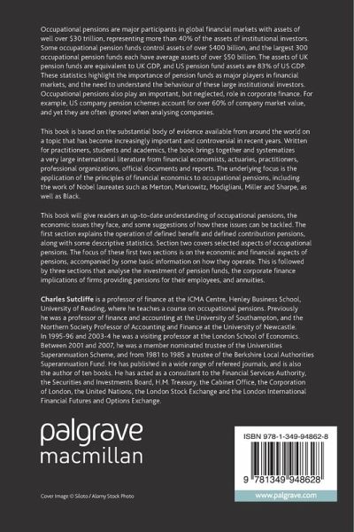 This book will give readers an up-to-dateunderstanding of occupational pensions, the economic issues they face, and somesuggestions of how these issues can be tackled. The first section explains theoperation of defined benefit and defined contribution pensions, along with somedescriptive statistics. The second section covers selected aspects ofoccupational pensions. The focus of these first two sections is on the economicand financial aspects of pensions, accompanied by some basic information onhowthey operate. This is followed by three further sections that analyse theinvestment of pension funds, the corporate finance implications of firmsproviding pensions for their employees, and annuities.