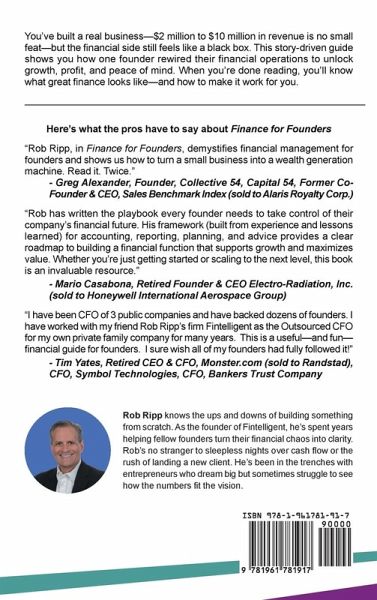 You've built a real business-$2 million to $10 million in revenue is no small feat-but the financial side still feels like a black box. This story-driven guide shows you how one founder rewired their financial operations to unlock growth, profit, and peace of mind. When you're done reading, you'll know what great finance looks like-and how to make it work for you. Here's what the pros have to say about Finance for Founders: "Rob Ripp, in Finance for Founders, demystifies financial management for founders and shows us how to turn a small business into a wealth generation machine. Read it. Twice." - Greg Alexander, Founder, Collective 54, Capital 54, Former Co- Founder & CEO, Sales Benchmark Index (sold to Alaris Royalty Corp.) "Rob has written the playbook every founder needs to take control of their company's financial future. His framework (built from experience and lessons learned) for accounting, reporting, planning, and advice provides a clear roadmap to building a financial function that supports growth and maximizes value. Whether you're just getting started or scaling to the next level, this book is an invaluable resource." - Mario Casabona, Retired Founder & CEO Electro-Radiation, Inc. (sold to Honeywell International Aerospace Group) "I have been CFO of 3 public companies and have backed dozens of founders. I have worked with my friend Rob Ripp's firm Fintelligent as the Outsourced CFO for my own private family company for many years. This is a useful-and fun-financial guide for founders. I sure wish all of my founders had fully followed it!" - Tim Yates, Retired CEO & CFO, Monster.com (sold to Randstad), CFO, Symbol Technologies, CFO, Bankers Trust Company