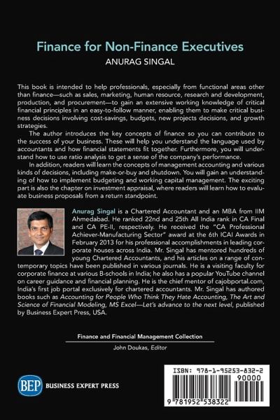 This book is intended to help professionals gain an extensive working knowledge of critical financial principles in an easy-to-follow manner. This book is intended to help professionals, especially from functional areas other than finance-such as sales, marketing, human resource, research and development, production, and procurement-to gain an extensive working knowledge of critical financial principles in an easy-to-follow manner, enabling them to make critical business decisions involving cost-savings, budgets, new projects decisions, and growth strategies. The author introduces the key concepts of finance so you can contribute to the success of your business. These will help you understand the language used by accountants and how financial statements fit together. Furthermore, you will understand how to use ratio analysis to get a sense of the company's performance. In addition, readers will learn the concepts of management accounting and various kinds of decisions, including make-or-buy and shutdown. Readers will gain an understanding of how to implement budgeting and working capital management. The exciting part is also the chapter on investment appraisal, where readers will learn how to evaluate business proposals from a return standpoint.