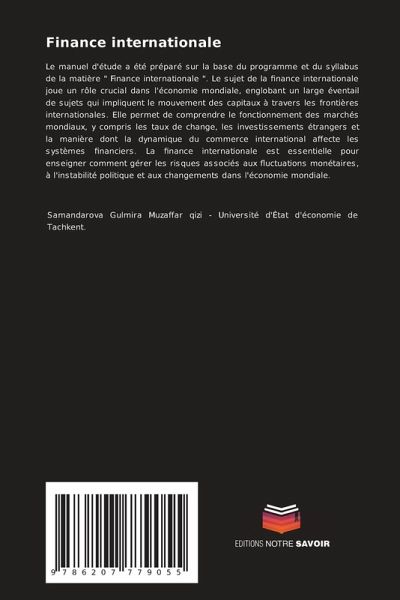 Le manuel d'étude a été préparé sur la base du programme et du syllabus de la matière " Finance internationale ". Le sujet de la finance internationale joue un rôle crucial dans l'économie mondiale, englobant un large éventail de sujets qui impliquent le mouvement des capitaux à travers les frontières internationales. Elle permet de comprendre le fonctionnement des marchés mondiaux, y compris les taux de change, les investissements étrangers et la manière dont la dynamique du commerce international affecte les systèmes financiers. La finance internationale est essentielle pour enseigner comment gérer les risques associés aux fluctuations monétaires, à l'instabilité politique et aux changements dans l'économie mondiale.