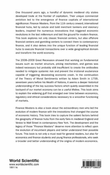 One thousand years ago, a handful of dynamic medieval city states developed trade at the frontier of capitalism. Their unique commercial ambition led to the emergence of finance capitals of international significance: Finance Masters. From the 11th century onward, international financial hubs, led by astute and bold merchant bankers and visionary leaders, inspired the numerous innovations that triggered economic revolutions in the last millennium and laid the ground for modern finance. This book explores not only classic financial centers, but also offshore financial centers and gambling centers to connect them to contemporary finance, and it also delves into the unique function of leading financial hubs to execute financial transactions over a wide geographical domain and transform the world economy. The 2008–2009 Great Recession showed that working on fundamental issues such as market structure, pricing mechanism, and games was indeed necessary but probably still insufficient to create the antibodies needed to mitigate systemic risk and prevent the irrational exuberance capable of triggering devastating economic crash. In the continuation of the Theory of Moral Sentiments written by Adam Smith in 1759, seventeen years before his Wealth of Nations, it seems a deeper historical understanding of the key success factors which quietly assembled in the backyard of our market economy can be a useful lifeline. This book aims to explain the widening gulf that emerged over time between economics, regulatory and ethical considerations necessary to a smoother functioning of markets. Finance Masters is also a book about the extraordinary men who led the evolution of modern finance with the innovations that changed the course of economic history. This book tries to capture the salient factors behind the geography of finance hubs from the early fairs in medieval England and Venice to Wall Street in contemporary New York. The development and the legacy of those "Finance Masters" deserve more attention to reflect upon the evolution of incumbent players and better understand their possible future. This book a must read for economics and finance students and young finance professionals, who seek a broader and better understanding of the origins of modern economics.