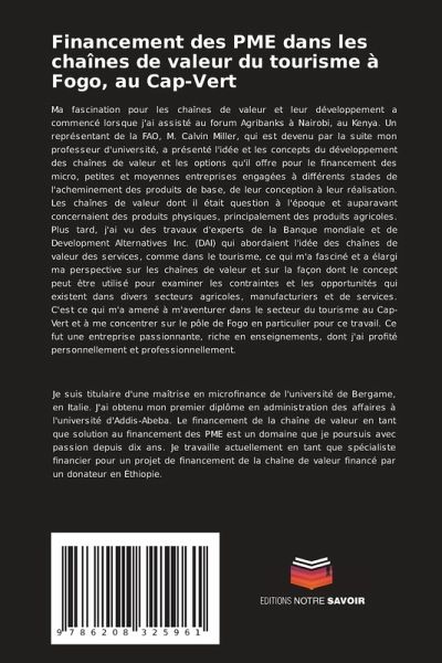 Ma fascination pour les chaînes de valeur et leur développement a commencé lorsque j'ai assisté au forum Agribanks à Nairobi, au Kenya. Un représentant de la FAO, M. Calvin Miller, qui est devenu par la suite mon professeur d'université, a présenté l'idée et les concepts du développement des chaînes de valeur et les options qu'il offre pour le financement des micro, petites et moyennes entreprises engagées à différents stades de l'acheminement des produits de base, de leur conception à leur réalisation. Les chaînes de valeur dont il était question à l'époque et auparavant concernaient des produits physiques, principalement des produits agricoles. Plus tard, j'ai vu des travaux d'experts de la Banque mondiale et de Development Alternatives Inc. (DAI) qui abordaient l'idée des chaînes de valeur des services, comme dans le tourisme, ce qui m'a fasciné et a élargi ma perspective sur les chaînes de valeur et sur la façon dont le concept peut être utilisé pour examiner les contraintes et les opportunités qui existent dans divers secteurs agricoles, manufacturiers et de services. C'est ce qui m'a amené à m'aventurer dans le secteur du tourisme au Cap-Vert et à me concentrer sur le pôle de Fogo en particulier pour ce travail. Ce fut une entreprise passionnante, riche en enseignements, dont j'ai profité personnellement et professionnellement.
