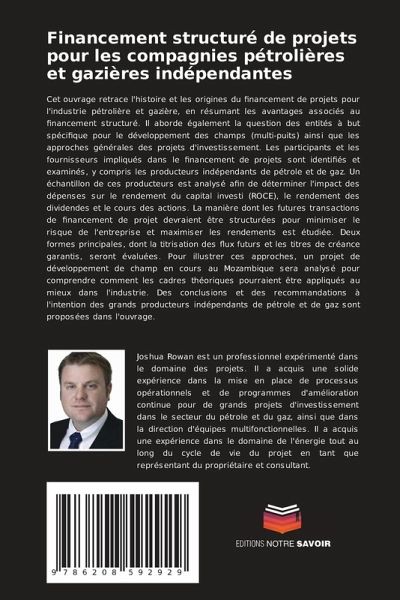 Cet ouvrage retrace l'histoire et les origines du financement de projets pour l'industrie pétrolière et gazière, en résumant les avantages associés au financement structuré. Il aborde également la question des entités à but spécifique pour le développement des champs (multi-puits) ainsi que les approches générales des projets d'investissement. Les participants et les fournisseurs impliqués dans le financement de projets sont identifiés et examinés, y compris les producteurs indépendants de pétrole et de gaz. Un échantillon de ces producteurs est analysé afin de déterminer l'impact des dépenses sur le rendement du capital investi (ROCE), le rendement des dividendes et le cours des actions. La manière dont les futures transactions de financement de projet devraient être structurées pour minimiser le risque de l'entreprise et maximiser les rendements est étudiée. Deux formes principales, dont la titrisation des flux futurs et les titres de créance garantis, seront évaluées. Pour illustrer ces approches, un projet de développement de champ en cours au Mozambique sera analysé pour comprendre comment les cadres théoriques pourraient être appliqués au mieux dans l'industrie. Des conclusions et des recommandations à l'intention des grands producteurs indépendants de pétrole et de gaz sont proposées dans l'ouvrage.