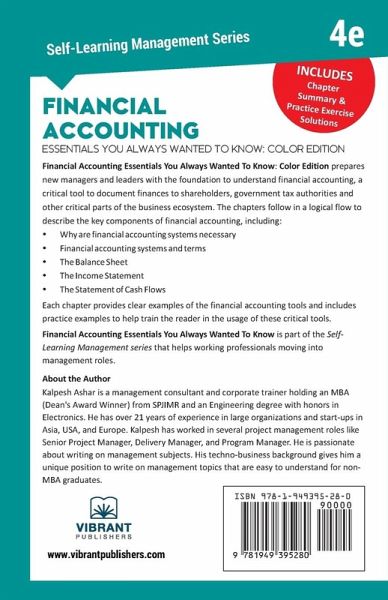 This book contains Chapter Summaries and Solutions to Practice Exercises. It covers aspects of financial accounting and managerial accounting as well as the following concepts: ¿ Financial Accounting Terms and Concepts ¿ Need, nature and purpose of Financial Statements ¿ Audience of Financial Statements ¿ Balance Sheet ¿ Income Statement ¿ Statement of Cash Flows Financial Accounting Essentials You Always Wanted To Know: 4th Edition prepares new managers and leaders with the foundation to understand financial accounting, a critical tool to document finances to shareholders, government tax authorities and other critical parts of the business ecosystem. The chapters follow in a logical flow to describe the key components of financial accounting, including: ¿ Why are financial accounting systems necessary? ¿ Financial accounting systems and terms ¿ The Balance Sheet ¿ The Income Statement ¿ The Statement of Cash Flows Each chapter provides clear examples of the financial accounting tools and includes practice examples to help train the reader in the usage of these critical tools. About the Series The Self-Learning Management Series is designed to help students, new managers, career switchers and entrepreneurs learn essential management lessons. This series has marketing books, management books, accounting books and more, that have been designed to address every aspect of business across every industry. Each book includes basic fundamentals, important concepts, standard and well-known principles, and practical ways of application of the subject matter. The distinctiveness of the series lies in that all the relevant information is bundled in a compact form that is very easy to interpret.