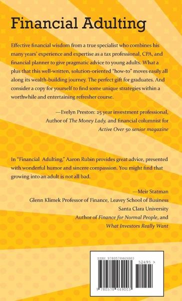 Whether you’re about to start your first job, thinking about saving for your child’s college fund, or actively planning for retirement, Financial Adulting is full of useful information designed to help you avoid common pitfalls and position yourself for success. As a California attorney, Certified Public Accountant, and Certified Financial Planner©, Aaron Rubin has seen it all, and many times it’s not a pretty picture. Never shy to tell it how it is, Rubin provides practical advice about budgeting and saving, taxes, investments, insurance, and estate planning. He tells you what to avoid, what to focus on, and isn’t afraid to call out those who may not be looking out for your best interests. Rubin also connects with readers through shared experiences. He acknowledges his own shortfalls and tells stories out of his own life (some amusing, and others cringeworthy). We all make mistakes and feel foolish at times, but it’s from these mistakes that we can learn and grow. Adulting can be scary, particularly when it comes to our finances, but with practice (and some decent Chardonnay), you will be amazed how well you can navigate these tricky waters.