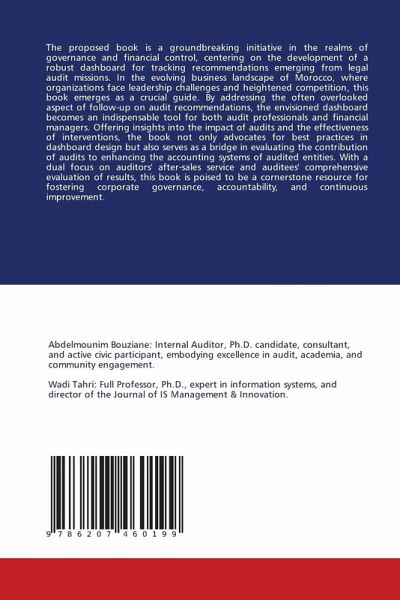 The proposed book is a groundbreaking initiative in the realms of governance and financial control, centering on the development of a robust dashboard for tracking recommendations emerging from legal audit missions. In the evolving business landscape of Morocco, where organizations face leadership challenges and heightened competition, this book emerges as a crucial guide. By addressing the often overlooked aspect of follow-up on audit recommendations, the envisioned dashboard becomes an indispensable tool for both audit professionals and financial managers. Offering insights into the impact of audits and the effectiveness of interventions, the book not only advocates for best practices in dashboard design but also serves as a bridge in evaluating the contribution of audits to enhancing the accounting systems of audited entities. With a dual focus on auditors' after-sales service and auditees' comprehensive evaluation of results, this book is poised to be a cornerstone resource for fostering corporate governance, accountability, and continuous improvement.