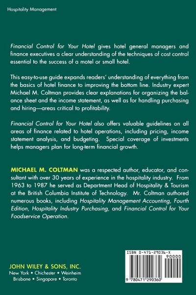 Financial Control for Your Hotel gives hotel general managers and finance executives a clear understanding of the techniques of cost control essential to the success of a motel or small hotel. This easy-to-use guide expands readers? understanding of everything from the basics of hotel finance to improving the bottom line. Industry expert Michael M. Coltman provides clear explanations for organizing the balance sheet and the income statement, as well as for handling purchasing and hiring?areas critical to profitability. Financial Control for Your Hotel also offers valuable guidelines on all areas of finance related to hotel operations, including pricing, income statement analysis, and budgeting. Special coverage of investments helps managers plan for long-term financial growth.