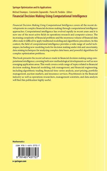 The increasing complexity of financial problems and the enormous volume of financial data often make it difficult to apply traditional modeling and algorithmic procedures. In this context, the field of computational intelligence provides an arsenal of particularly useful techniques. These techniques include new modeling tools for decision making under risk and uncertainty, data mining techniques for analyzing complex data bases, and powerful algorithms for complex optimization problems. Computational intelligence has also evolved rapidly over the past few years and it is now one of the most active fields in operations research and computer science. This volume presents the recent advances of the use of computation intelligence in financial decision making. The book covers all the major areas of computational intelligence and a wide range of problems in finance, such as portfolio optimization, credit risk analysis, asset valuation, financial forecasting, and trading.