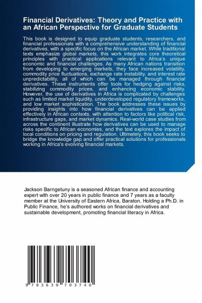 This book is designed to equip graduate students, researchers, and financial professionals with a comprehensive understanding of financial derivatives, with a specific focus on the African market. While traditional texts emphasize global markets, this work integrates core theoretical principles with practical applications relevant to Africa's unique economic and financial challenges. As many African nations transition from developing to emerging markets, they face increased volatility, commodity price fluctuations, exchange rate instability, and interest rate unpredictability, all of which can be managed through financial derivatives. These instruments offer tools for hedging against risks, stabilizing commodity prices, and enhancing economic stability. However, the use of derivatives in Africa is complicated by challenges such as limited market liquidity, underdeveloped regulatory frameworks, and low market sophistication. The book addresses these issues by providing insights into how financial derivatives can be applied effectively in African contexts, with attention to factors like political risk, infrastructure gaps, and market dynamics. Real-world case studies from across the continent illustrate how derivatives can be used to manage risks specific to African economies, and the text explores the impact of local conditions on pricing and regulation. Ultimately, this book seeks to bridge the knowledge gap and offer practical solutions for professionals working in Africa's evolving financial markets.