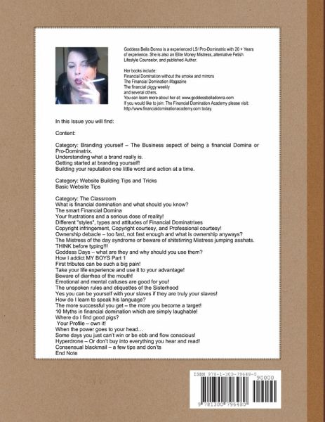 Welcome to the first Digest Edition for the Financial Domination Academy for women. In this Issue you will find the following Articles: Content: Understanding what a brand really is. Getting started at branding yourself! Building your reputation one little word and action at a time. What is financial domination and what should you know? The smart Financial Domina Your frustrations and a serious dose of reality! Different "styles", types and attitudes of Financial Dominatrixes Copyright infringement, Copyright courtesy, and Professional courtesy! Ownership debacle - too fast, not fast enough and what is ownership anyways? The Mistress of the day syndrome or beware of shitstirring Mistress jumping asshats. THINK before typing!!! Goddess Days - what are they and why should you use them? How I addict MY BOYS Part 1 First tributes can be such a big pain! Take your life experience and use it to your advantage! and many more. This field is too short to list them all.