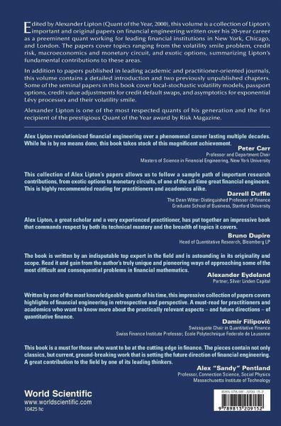 Edited by Alexander Lipton (Quant of the Year, 2000), this volume is a collection of Lipton's important and original papers on financial engineering written over his 20-year career as a preeminent quant working for leading financial institutions in New York, Chicago, and London. The papers cover topics ranging from the volatility smile problem, credit risk, macroeconomics and monetary circuit, and exotic options, summarizing Lipton's fundamental contributions to these areas. In addition to papers published in leading academic and practitioner-oriented journals, this volume contains a detailed introduction and two previously unpublished chapters. Some of the seminal papers in this book cover local-stochastic volatility models, passport options, credit value adjustments for credit default swaps, and asymptotics for exponential Lévy processes and their volatility smile. Alexander Lipton is one of the most respected quants of his generation and the first recipient of the prestigious Quant of the Year award by Risk Magazine.