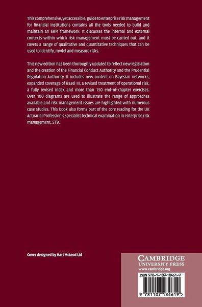 1. An introduction to enterprise risk management 2. Types of financial institution 3. Stakeholders 4. The internal environment 5. The external environment 6. Process overview 7. Definitions of risk 8. Risk identification 9. Some useful statistics 10. Statistical distributions 11. Modelling techniques 12. Extreme value theory 13. Modelling time series 14. Quantifying particular risks 15. Risk assessment 16. Responses to risk 17. Continuous considerations 18. Economic capital 19. Risk frameworks 20. Case studies 21. Solutions to questions References Index.