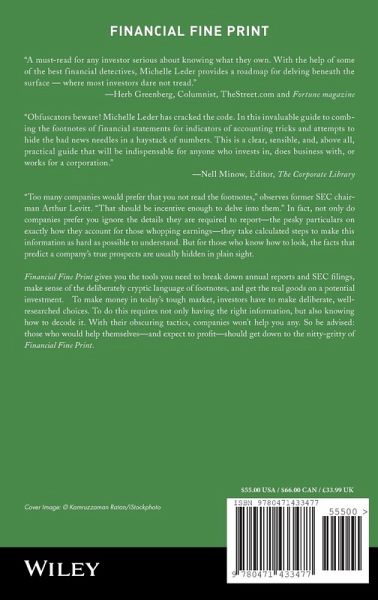 "A must-read for any investor serious about knowing what they own. With the help of some of the best financial detectives, Michelle Leder provides a roadmap for delving beneath the surface -- where most investors dare not tread." -Herb Greenberg, Columnist, TheStreet.com and Fortune magazine "Obfuscators beware! Michelle Leder has cracked the code. In this invaluable guide to combing the footnotes of financial statements for indicators of accounting tricks and attempts to hide the bad news needles in a haystack of numbers. This is a clear, sensible, and, above all, practical guide that will be indispensable for anyone who invests in, does business with, or works for a corporation." -Nell Minow, Editor, The Corporate Library "Too many companies would prefer that you not read the footnotes," observes former SEC chairman Arthur Levitt. "That should be incentive enough to delve into them." In fact, not only do companies prefer you ignore the details they are required to report-the pesky particulars on exactly how they account for those whopping earnings-they take calculated steps to make this information as hard as possible to understand. But for those who know how to look, the facts that predict a company's true prospects are usually hidden in plain sight. Financial Fine Print gives you the tools you need to break down annual reports and SEC filings, make sense of the deliberately cryptic language of footnotes, and get the real goods on a potential investment. To make money in today's tough market, investors have to make deliberate, well-researched choices. To do this requires not only having the right information, but also knowing how to decode it. With their obscuring tactics, companies won't help you any. So be advised: those who would help themselves-and expect to profit-should get down to the nitty-gritty of Financial Fine Print.