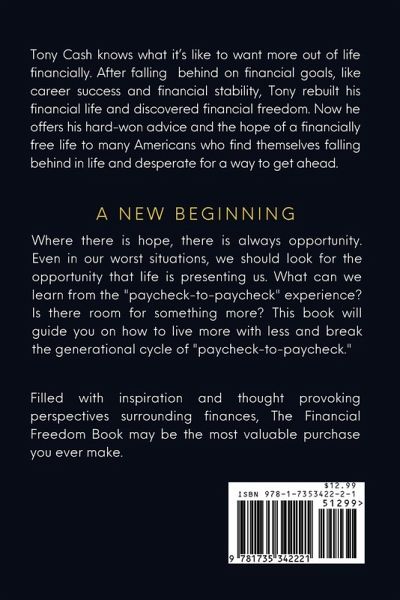 Tony Cash knows what it's like to want more out of life financially. After falling behind on financial goals, like career success and financial stability, Tony rebuilt his financial life and discovered financial freedom. Now he offers his hard-won advice and the hope of a financially free life to many Americans who find themselves falling behind in life and desperate for a way to get ahead. A NEW BEGINNING Where there is hope, there is always opportunity. Even in our worst situations, we should look for the opportunity that life is presenting us. What can we learn from the "paycheck-to-paycheck" experience? Is there room for something more? This book will guide you on how to live more with less and break the generational cycle of "paycheck-to-paycheck." Filled with inspiration and thought provoking perspectives surrounding finances, The Financial Freedom Book may be the most valuable purchase you ever make.