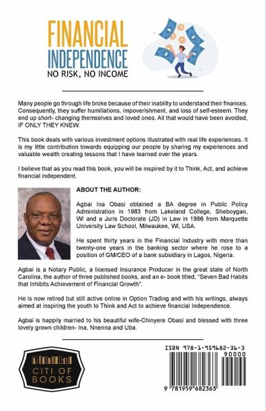 Many people go through life broke because of their inability to understand their finances. Consequently, they suffer humiliation, impoverishment, and loss of self-esteem. They end up short-changing themselves and loved ones. All that would have been avoided, IF ONLY THEY KNEW.This book deals with various investment options illustrated with real-life experiences. It is my little contribution towards equipping our people by sharing my experiences and valuable wealth creating lessons that I have learned over the years.I believe that as you read this book, you will be inspired by it to Think, Act, and achieve financial independence.