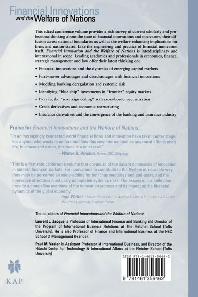 Praise for Financial Innovations and the Welfare of Nations `In an increasingly connected world financial flows and innovation have taken center stage. For anyone who wants to understand how this new international arrangement affects one's life, business, and nation, this book is a must read.' Walter B. Wriston, Former CEO, Citigroup `This is a first-rate conference volume that covers all of the salient dimensions of innovation in modern financial markets. For innovations to contribute to the System in a durable way, they must be perceived as value-adding for both intermediaries and end-users, and the innovative structures must carry acceptable systemic risks. The essays in this collection provide a compelling overview of the innovation process and its impact on the financial dynamics of the global economy.' Ingo Walter, Charles Simon Chair in Applied Financial Economics and Director, New York University Solomon Center