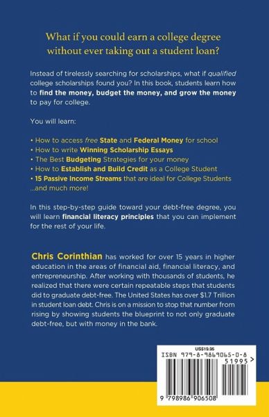 What if you could earn a college degree, without ever having to take out a student loan? Instead of tirelessly searching for scholarships, what if qualified college scholarships found you? In this book, students learn how to find the money, budget the money, and grow the money to pay for college. You will learn: · How to access free State and Federal Money for school · How to write Winning Scholarship Essays · Best Budgeting Strategies for your money · How to Establish and Build Credit as a College Student · 15 Passive Income Streams that are ideal for College Students · ...and much more! In this step-by-step guide toward your debt-free degree, you will learn financial literacy principles that you can implement for the rest of your life.
