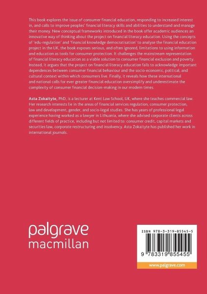 This book explores the issue of consumer financial education, responding to increased interest in, and calls to improve peoples' financial literacy skills and abilities to understand and manage their money. New conceptual frameworks introduced in the book offer academic audiences an innovative way of thinking about the project on financial literacy education. Using the concepts of 'edu-regulation' and 'financial knowledge democratisation' to analyse the financial education project in the UK, the book exposes serious, and often ignored, limitations to using information and education as tools for consumer protection. It challenges the mainstream representation of financial literacy education as a viable solution to consumer financial exclusion and poverty. Instead, it argues that the project on financial literacy education fails to acknowledge important dependences between consumer financial behaviour and the socio-economic, political, and cultural context within which consumers live. Finally, it reveals how these international and national calls for ever greater financial education oversimplify and underestimate the complexity of consumer financial decision-making in our modern times.