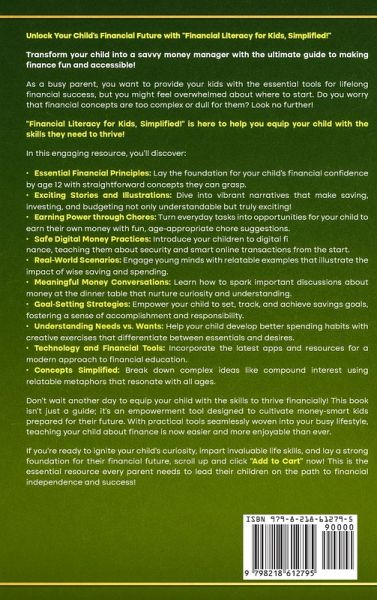 Unlock Your Child's Financial Future with "Financial Literacy for Kids, Simplified!" Transform your child into a savvy money manager with the ultimate guide to making finance fun and accessible! As a busy parent, you want to provide your kids with the essential tools for lifelong financial success, but you might feel overwhelmed about where to start. Do you worry that financial concepts are too complex or dull for them? Look no further! "Financial Literacy for Kids, Simplified!" is here to help you equip your child with the skills they need to thrive! In this engaging resource, you'll discover: Essential Financial Principles: Lay the foundation for your child's financial confidence by age 12 with straightforward concepts they can grasp. Exciting Stories and Illustrations: Dive into vibrant narratives that make saving, investing, and budgeting not only understandable but truly exciting! Earning Power through Chores: Turn everyday tasks into opportunities for your child to earn their own money with fun, age-appropriate chore suggestions. Interactive Learning Games: Keep your kids entertained while reinforcing important financial concepts through enjoyable activities. Safe Digital Money Practices: Introduce your children to digital finance, teaching them about security and smart online transactions from the start. Real-World Scenarios: Engage young minds with relatable examples that illustrate the impact of wise saving and spending. Meaningful Money Conversations: Learn how to spark important discussions about money at the dinner table that nurture curiosity and understanding. Goal-Setting Strategies: Empower your child to set, track, and achieve savings goals, fostering a sense of accomplishment and responsibility. Budget Buddy System: Make budgeting a collaborative and enjoyable experience, instilling valuable life skills together. Understanding Needs vs. Wants: Help your child develop better spending habits with creative exercises that differentiate between essentials and desires. Technology and Financial Tools: Incorporate the latest apps and resources for a modern approach to financial education. Concepts Simplified: Break down complex ideas like compound interest using relatable metaphors that resonate with all ages. Don't wait another day to equip your child with the skills to thrive financially! This book isn't just a guide; it's an empowerment tool designed to cultivate money-smart kids prepared for their future. If you're ready to ignite your child's curiosity, impart invaluable life skills, and lay a strong foundation for their financial future, click "Add to Cart" now!
