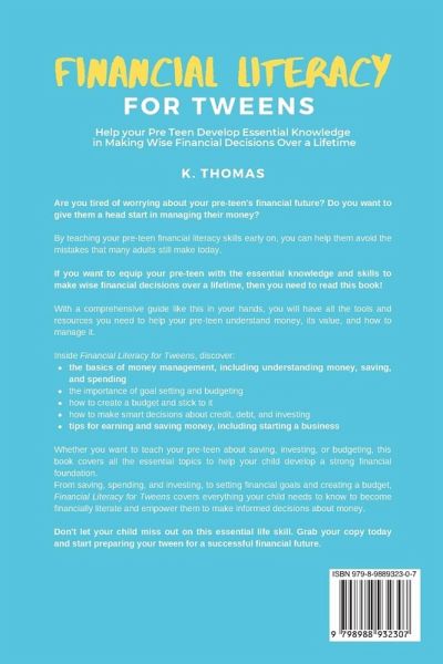 Are you tired of worrying about your pre-teen's financial future? Do you want to give them a head start in managing their money? By teaching your pre-teen financial literacy skills early on, you can help them avoid the mistakes that many adults still make today. If you want to equip your pre-teen with the essential knowledge and skills to make wise financial decisions over a lifetime, then you need to read this book! With a comprehensive guide like this in your hands, you will have all the tools and resources you need to help your pre-teen understand money, its value, and how to manage it. Inside Financial Literacy for Tweens, discover: ¿ the basics of money management, including understanding money, saving, and spending ¿ the importance of goal setting and budgeting ¿ how to create a budget and stick to it ¿ how to make smart decisions about credit, debt, and investing ¿ tips for earning and saving money, including starting a business Whether you want to teach your pre-teen about saving, investing, or budgeting, this book covers all the essential topics to help your child develop a strong financial foundation. From saving, spending, and investing, to setting financial goals and creating a budget, Financial Literacy for Tweens covers everything your child needs to know to become financially literate and empower them to make informed decisions about money. Don't let your child miss out on this essential life skill. Grab your copy today and start preparing your tween for a successful financial future.