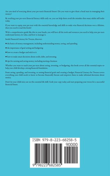 Are you tired of worrying about your pre-teen's financial future? Do you want to give them a head start in managing their money? By teaching your pre-teen financial literacy skills early on, you can help them avoid the mistakes that many adults still make today. If you want to equip your pre-teen with the essential knowledge and skills to make wise financial decisions over a lifetime, then you need to read this book! With a comprehensive guide like this in your hands, you will have all the tools and resources you need to help your pre-teen understand money, its value, and how to manage it. Inside Financial Literacy for Tweens, discover: ¿ the basics of money management, including understanding money, saving, and spending ¿ the importance of goal setting and budgeting ¿ how to create a budget and stick to it ¿ how to make smart decisions about credit, debt, and investing ¿ tips for earning and saving money, including starting a business Whether you want to teach your pre-teen about saving, investing, or budgeting, this book covers all the essential topics to help your child develop a strong financial foundation. From saving, spending, and investing, to setting financial goals and creating a budget, Financial Literacy for Tweens covers everything your child needs to know to become financially literate and empower them to make informed decisions about money. Don't let your child miss out on this essential life skill. Grab your copy today and start preparing your tween for a successful financial future.