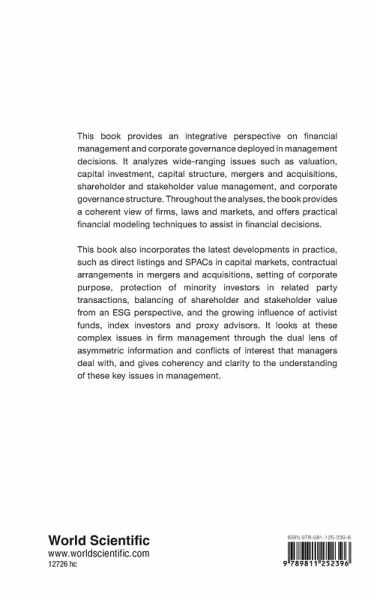 This book provides an integrative perspective on financial management and corporate governance deployed in management decisions. It analyzes wide-ranging issues such as valuation, capital investment, capital structure, mergers and acquisitions, shareholder and stakeholder value management, and corporate governance structure. Throughout the analyses, the book provides a coherent view of firms, laws and markets, and offers practical financial modeling techniques to assist in financial decisions. This book also incorporates the latest developments in practice, such as direct listings and SPACs in capital markets, contractual arrangements in mergers and acquisitions, setting of corporate purpose, protection of minority investors in related party transactions, balancing of shareholder and stakeholder value from an ESG perspective, and the growing influence of activist funds, index investors and proxy advisors. It looks at these complex issues in firm management through the dual lens of asymmetric information and conflicts of interest that managers deal with, and gives coherency and clarity to the understanding of these key issues in management.