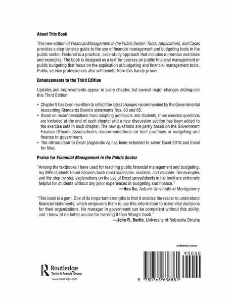 Part 1: Tools for Financial Planning 1. Revenue Forecasting 2. Resource Development Analysis 3. Cost Estimation 4. Cost Comparison 5. Incremental Cost Analysis 6. Cost-Benefit Analysis Part 2: Tools for Financial Implementation 7. Financial Performance Monitoring 8. Cash Management: Determining the Optimal Cash Balance Part 3: Tools for Financial Reporting and Analysis 9. Financial Reporting and Analysis: The Statement of Net Assets and the Statement of Net Position 10. Financial Reporting and Analysis: The Statement of Activities 11. Financial Reporting and Analysis: Fund-Level Statements 12. Financial Condition Analysis 13. Debt Capacity Analysis 14. Financial Risk Assessment: Analyzing the Risk of Revenue Loss