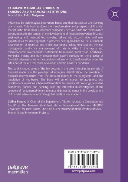 Influenced by technological innovation, banks and their businesses are changing dramatically. This book explores the transformation and prospects of financial market institutions (banks, insurance companies, pension funds and microfinance organizations) in the context of the development of financial innovation, financial engineering and financial technologies, taking into account risks and new opportunities for development. It presents new approaches to the sustainable development of financial and credit institutions, taking into account the risk management and crisis management of their activities in the macro and microeconomic environment. Contributors from Russia, Kazakhstan, Azerbaijan, Mongolia, Ireland and Italy present their expert opinions on the practice of financial intermediaries in the conditions of economic transformation under the influence of the 4th Industrial Revolution and the Covid-19 pandemic.