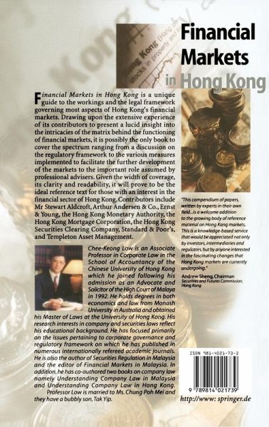 Financial Markets in Hong Kong is a unique guide to the workings and the legal framework governing all aspects of Hong Kong's financial markets. Drawing upon the extensive experience of its contributors to present a lucid insight into the intricacies of the matrix behind the functioning of financial markets, it is possibly the only book to cover the spectrum ranging from a discussion on the regulatory framework to the various measures implemented to facilitate the further development of the markets to the important role assumed by professional advisers. Given the width of coverage, its clarity and readability, it will prove to be the ideal reference text for those with an interest in the financial sector of Hong Kong. Contributors include Templeton Asset Management Limited, Hong Kong; Standard & Poor's, Hong Kong; Ernst & Young, Hong Kong; Arthur Anderson & Co., Hong Kong; The Hong Kong Monetary Authority, among others.