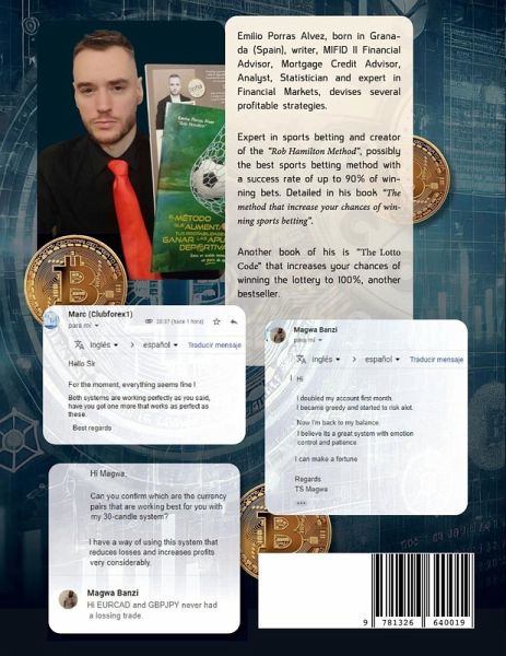 This book contains an intraday strategy that achieves up to 90% effectiveness in trading the Financial Markets: Forex, cryptocurrencies, stocks, indexes, CFDs, ETFs, commodities, etc. In this strategy the author details step by step, explaining it through graphs and positions made in real time how to put it into operation, explains where to place the stop loss, where to take profits, also talks about capital control, emotional control, recommended brokers, how to choose the best broker to invest in, among others. You will be able to put it into operation and start making money quickly due to its simplicity and the easy and direct way it is explained, even traders with little previous experience in the world of financial markets can use it. It has been created by Emilio Porras Alvez Financial Advisor MIFID II, Analyst, Statistician and Expert in Financial Markets. He is also the person who created the "Rob Hamilton Method" possibly the best method on the market for making sports bets with a success rate of up to 90% of winning bets as demonstrated by himself through the blogabet platform where he shows a clear example of the effectiveness of his method with 23 bets made in a row, 22 were won and 1 suspended due to bad weather, out of 23 bets none were lost, also from his daily bets and from clients of many nationalities who have given their testimony by exchanging emails talking about the effectiveness of the method and how much they are winning. He has also created possibly the best method to increase your chances of winning the lottery which guarantees you a 100% increase in probabilities by winning the smaller prizes more frequently and in this way getting closer and closer to winning a major prize as confirmed by all his clients since his first book was published several years ago. There are already some testimonies from people who have reported having won the first prize using his method. Once you have this strategy or any of its methods, you will always have the author's attention to achieve your goals in the form of profits. If you have any questions about this strategy or want me to send you proof of its effectiveness or any of its methods, you can contact us through the following emails: emilioporrasfinancialadvisor4t@gmail.com robhamiltonbet@gmail.com emil.lottocode@gmail.com