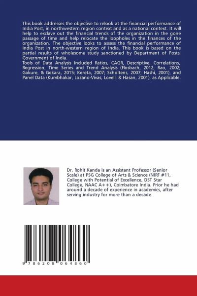 This book addresses the objective to relook at the financial performance of India Post, in northwestern region context and as a national context. It will help to exclave out the financial trends of the organization in the gone passage of time and help relocate the loopholes in the finances of the organization. The objective looks to assess the financial performance of India Post in north-western region of India. This book is based on the partial results of wholesome study sanctioned by Department of Posts, Government of India.Tools of Data Analysis Included Ratios, CAGR, Descriptive, Correlations, Regression, Time Series and Trend Analysis (Flosbach, 2012; Rao, 2002; Gakure, & Gekara, 2015; Kereta, 2007; Scholtens, 2007; Hashi, 2001), and Panel Data (Kumbhakar, Lozano-Vivas, Lovell, & Hasan, 2001), as Applicable.