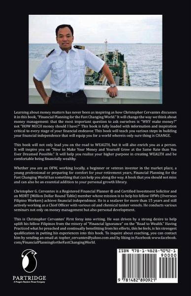 Learning about money matters has never been as inspiring as how Christopher Cervantes discusses it in this book, "Financial Planning for the Fast Changing World." It will change the way we think about money management: that the most important question to ask ourselves is "WHY make money?" not "HOW MUCH money should I have?" This book is fully loaded with information and inspiration critical to every stage of your financial endeavor. This book will teach you various steps in building your financial independence that will equip you for a world wherein only sure thing is CHANGE. This book will not only lead you on the road to WEALTH, but it will also enrich you as a person. It will inspire you on "How to Make Your Money and Yourself Grow at the Same Rate than You Ever Dreamed Possible." It will help you realize your higher purpose in creating WEALTH and be comfortable being financially wealthy. Whether you are an OFW, working locally, a beginner or veteran investor in the market place, a young professional or preparing for comfort for your retirement years, Financial Planning for the Fast Changing World has something that can help you along the way. A book that you should not miss and can also be an essential addition to your personal growth library.