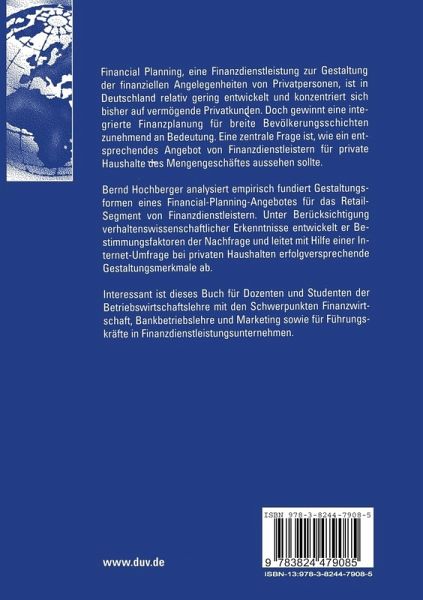 Bernd Hochberger analysiert empirisch fundiert Gestaltungsformen eines Financial-Planning-Angebotes für das Retail-Segment von Finanzdienstleistern. Unter Berücksichtigung verhaltenswissenschaftlicher Erkenntnisse entwickelt er Bestimmungsfaktoren der Nachfrage und leitet mit Hilfe einer Internet-Umfrage bei privaten Haushalten erfolgversprechende Gestaltungsmerkmale ab.