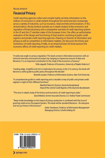 Credit reporting agencies collect and compile highly sensitive information on the millions of consumers in credit markets throughout the world and also increasingly across a variety of industries, such as insurance, retail and telecommunications. In this revised edition, Nicola Jentzsch provides an in-depth analysis of the economics and regulation of financial privacy and a comparative overview of credit reporting systems in the US and the 27 member states of the European Union. She offers an authoritative evaluation of the design and functioning of dual systems consisting of public credit registers and private credit reporting agencies. Drawing on theories of information and privacy as well as competition in information markets, she discusses the history and institutions of credit reporting. Finally, on an empirical level, the book assesses the economic effects of credit reporting on credit markets.