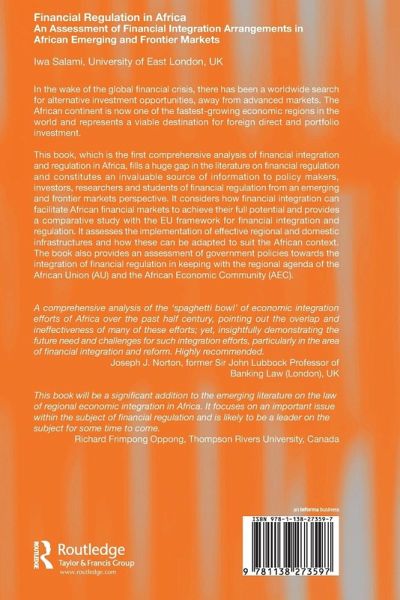 This book, which is the first comprehensive analysis of financial integration and regulation in Africa, fills a huge gap in the literature on financial regulation and constitutes an invaluable source of information to policy makers, investors, researchers and students of financial regulation from an emerging and frontier markets perspective. It considers how financial integration can facilitate African financial markets to achieve their full potential and provides a comparative study with the EU framework for financial integration and regulation.