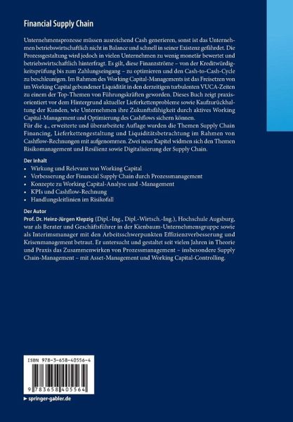 Für die 4., erweiterte und überarbeitete Auflage wurden die Themen Supply Chain Financing, Lieferkettengestaltung und Liquiditätsbetrachtung im Rahmen von Cashflow-Rechnungen mit aufgenommen. Zwei neue Kapitel widmen sich den Themen Risikomanagement und Resilienz sowie Digitalisierung der Supply Chain.