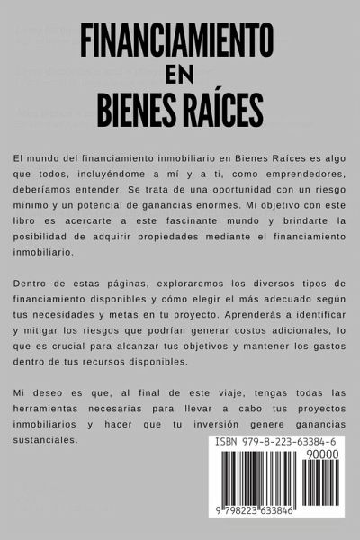 ¿Te gustaría descubrir cómo las grandes empresas desarrolladoras realizan proyectos inmobiliarios con ciertas técnicas de financiamiento? ¿Te interesaría aprender de dónde sacan el dinero las empresas inmobiliarias para realizar proyectos exitosos? ¿Sabías qué para realizar proyectos inmobiliarios puedes financiarte al 100% a comparación de otros negocios? Entonces acompáñame hasta el final. Yo hace un tiempo veía a las empresas desarrollar proyectos de lotización, habilitación urbana, edificios de apartamentos, etc. y me preguntaba. ¿cómo lo hacen? ¿Se necesitará una cantidad enorme de dinero para poder realizarlo? La respuesta a estas preguntas es un gran rotundo NO, sólo necesitas aprender todo de ello y tener una gran determinación y perseverancia. En este libro aprenderás. Aprenderás desarrollar proyectos de lotización y habilitaciones urbanas, edificios de apartamentos con técnicas y estrategias comprobadas de financiamiento que te revelaré a través de este libro. Aprenderás cómo realizar cualquier tipo de proyectos inmobiliarios con ciertas estrategias de financiamiento. Con mínimo capital. Descubrirás la principal fuente de financiamiento de cualquier proyecto inmobiliario. Aprenderás todo tipo de técnicas, estrategias, de financiamiento inmobiliario para llevar a cabo un proyecto ganador. Si tú quieres dar saltos cuánticos en tu vida, y aprender este tipo de negocios para alcanzar la libertad financiera en corto tiempo y cambiar tu estilo de vida y la de tu familia, entonces este libro es para ti. ¡Descarga tu copia hoy haciendo click en el botón COMPRAR AHORA en la parte superior de esta página!
