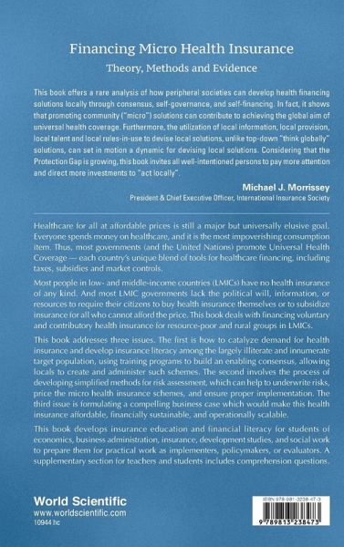 Healthcare for all at affordable prices is still a major but universally elusive goal. Everyone spends money on healthcare, and it is the most impoverishing consumption item. Thus, most governments (and the United Nations) promote Universal Health Coverage — each country's unique blend of tools for healthcare financing, including taxes, subsidies and market controls. Most people in low- and middle-income countries (LMICs) have no health insurance of any kind. And most LMIC governments lack the political will, information, or resources to require their citizens to buy health insurance themselves or to subsidize insurance for all who cannot afford the price. This book deals with financing voluntary and contributory health insurance for resource-poor and rural groups in LMICs. This book addresses three issues. The first is how to catalyse demand for health insurance and develop insurance literacy among the largely illiterate and innumerate target population, using training programs to build an enabling consensus, allowing locals to create and administer such schemes. The second involves the process of developing simplified methods for risk assessment, which can help to underwrite risks, price the micro health insurance schemes, and ensure proper implementation. The third issue is formulating a compelling business case which would make this health insurance affordable, financially sustainable, and operationally scalable. This book develops insurance education and financial literacy for students of economics, business administration, insurance, development studies, and social work to prepare them for practical work as implementers, policymakers, or evaluators. A supplementary section for teachers and students includes comprehension questions.