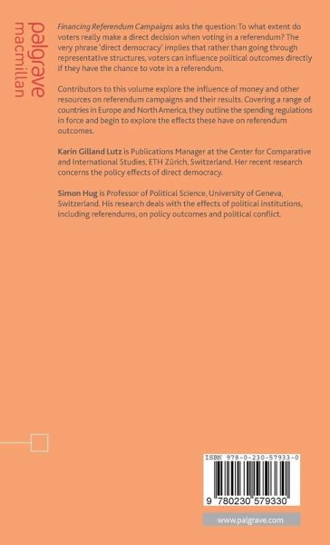 Introduction; K.Gilland Lutz & S.Hug Campaign Spending and Ballot Measures; T.Stratmann Regulating Campaign Finance in Canadian Referendums and Initiatives; R.Johnston US States; D.Smith Campaign Financing in Danish Referendums; S.Binzer Hobolt Financing Referendums and Initiatives in the Baltic States; D.Auers, J.Ruus & A.Krupavicius The Financing of Referendum Campaigns in France; F.Hamon Referendums and Spending in Ireland; K.Gilland Lutz Financing Referendum Campaigns in Italy; R.Ricci Financing Referendum Campaigns in Spain; C.Closa Montero & F.Carbonell Bellolio Referendum Campaign Regulations in Switzerland; U.Serdült Sledgehammers and Nuts? Regulating Referendums in the UK; N.Singh Ghaleigh Referendum Campaign Regulations in Europe and Latin America; T.Zellweger, U.Serdült, A.Zda & I.Renfer Conclusion; K.Gilland Lutz & S.Hug