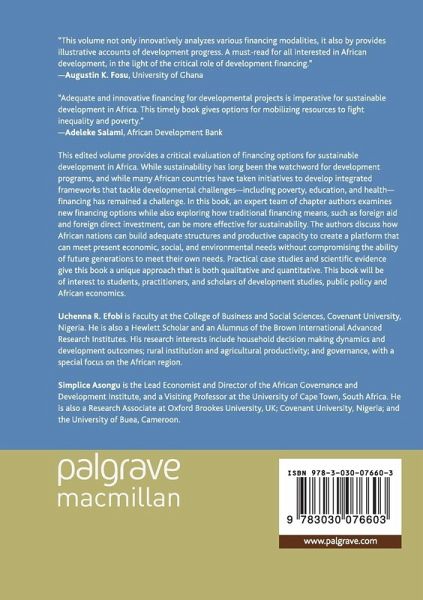 1. Introduction.- 2. Financing Mechanisms African Governments Should Pursue in Financing Sustainable Development in the Next 20 Years.- 3. Financial Inclusion and Foreign Market Participation of Firms: A Quasi-experiment from Nigeria.- 4. Business Regulations and Foreign Direct Investment in Sub-Saharan Africa: Implications for Regulatory Reform.- 5. Broadening Financial Intermediation in Sub-Saharan Africa.- 6. Institutions, Fiscal Performance, and Development Trajectories in ECOWAS: Implications for Sustainability.- 7. Capital Flows and Economic Growth: Does the Role of State Fragility Really Matter for Sustainability?.- 8. Changing Patterns of the Official Development Assistance to Sub-Saharan Africa.- 9. Financing Sustainable Energy Access with Oil Revenues in Sub-Saharan Africa: Trends and Strategies.- 10. Maximizing the Gains from Natural Resources.- 11. Does the Implementation of Social Safety Net Intervention Affect Indigenous Social Capital Systems for Coping with Livelihood Shocks? Ethnographic Evidence of Agro-Pastoral Communities in Eastern Ethiopia.- 12. Issues in Sustainable Development: The Environment-Income Relationship.- 13. Micro-credit, Child Education, and Health Outcomes: A Case Study from Ghana.- 14. Financial Inclusion and Growth of Non-Farm Enterprises in Ghana.- 15. The Role of Co-operative Organizations in Tanzania's Industrialization.- 16. The Textiles and Clothing Sector and the Industrialization of Sub-Saharan Africa.