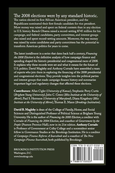 " The 2008 elections were by any standard historic. The nation elected its first African American president, and the Republicans nominated their first female candidate for vice president. More money was raised and spent on federal contests than in any election in U.S. history. Barack Obama raised a record-setting $745 million for his campaign and federal candidates, party committees, and interest groups also raised and spent record-setting amounts. Moreover, the way money was raised by some candidates and party committees has the potential to transform American politics for years to come. The latest installment in a series that dates back half a century, Financing the 2008 Election is the definitive analysis of how campaign finance and spending shaped the historic presidential and congressional races of 2008. It explains why these records were set and what it means for the future of U.S. politics. David Magleby and Anthony Corrado have assembled a team of experts who join them in exploring the financing of the 2008 presidential and congressional elections. They provide insights into the political parties and interest groups that made campaign finance history and summarize important legal and regulatory changes that affected these elections. Contributors: Allan Cigler (University of Kansas), Stephanie Perry Curtis (Brigham Young University), John C. Green (Bliss Institute at the University of Akron), Paul S. Herrnson (University of Maryland), Diana Kingsbury (Bliss Institute at the University of Akron), Thomas E. Mann (Brookings Institution)."