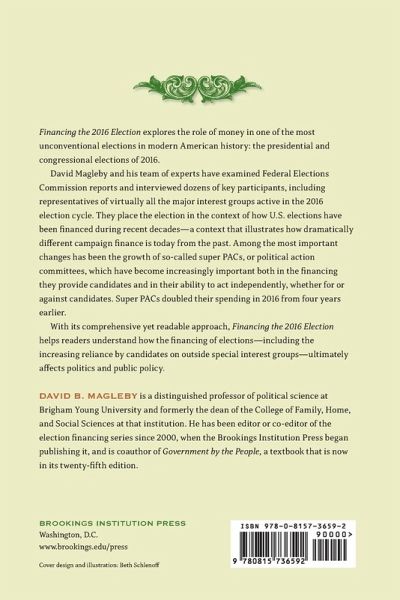 Contents: Preface and Acknowledgments 1. Change and Continuity in the Financing of the 2016 U.S. Federal Election David B. Magleby 2. The Regulatory Environment of the 2016 Election Anthony Corrado 3. Interest Groups in the 2016 Election David B. Magleby and Jay Goodliffe 4. Financing the 2016 Presidential Nomination Campaigns John C. Green 5. Financing the 2016 Presidential General Election David A. Hopkins 6. Financing the 2016 Congressional Election Molly E. Reynolds and Richard L. Hall 7. Party Money in the 2016 Election Diana Dwyre and Robin Kolodny 8. Political and Policy Implications following the 2016 Election David B. Magleby Appendix: List of Interviews Contributors Index