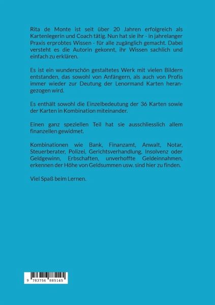 Rita de Monte ist seit über 20 Jahren erfolgreich als Kartenlegerin und Coach tätig. Nun hat sie ihr - in jahrelanger Praxis erprobtes Wissen - für alle zugänglich gemacht. Dabei versteht es die Autorin gekonnt, ihr Wissen sachlich und einfach zu erklären.Es ist ein wunderschön gestaltetes Werk mit vielen Bildern entstanden, das sowohl von Anfängern, als auch von Profis immer wieder zur Deutung der Lenormand Karten herangezogen wird. Es enthält sowohl die Einzelbedeutung der 36 Karten sowie der Karten in Kombination miteinander.Einen ganz speziellen Teil hat sie ausschliesslich allem finanzellen gewidmet.Kombinationen wie Bank, Finanzamt, Anwalt, Notar, Steuerberater, Polizei, Gerichtsverhandlung, Insolvenz oder Geldgewinn, Erbschaften, unverhoffte Geldeinnahmen, erkennen der Höhe von Geldsummen usw. sind hier zu finden. Viel Spaß beim Lernen.
